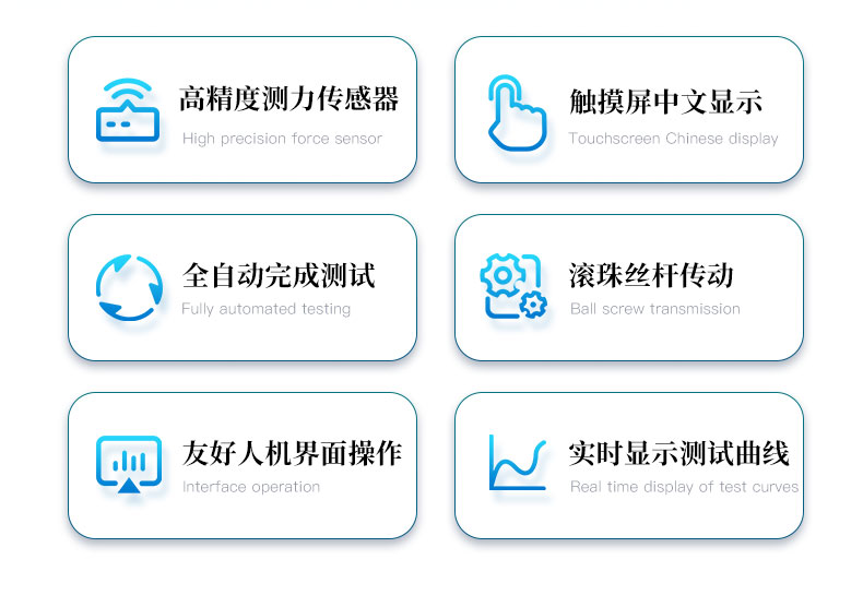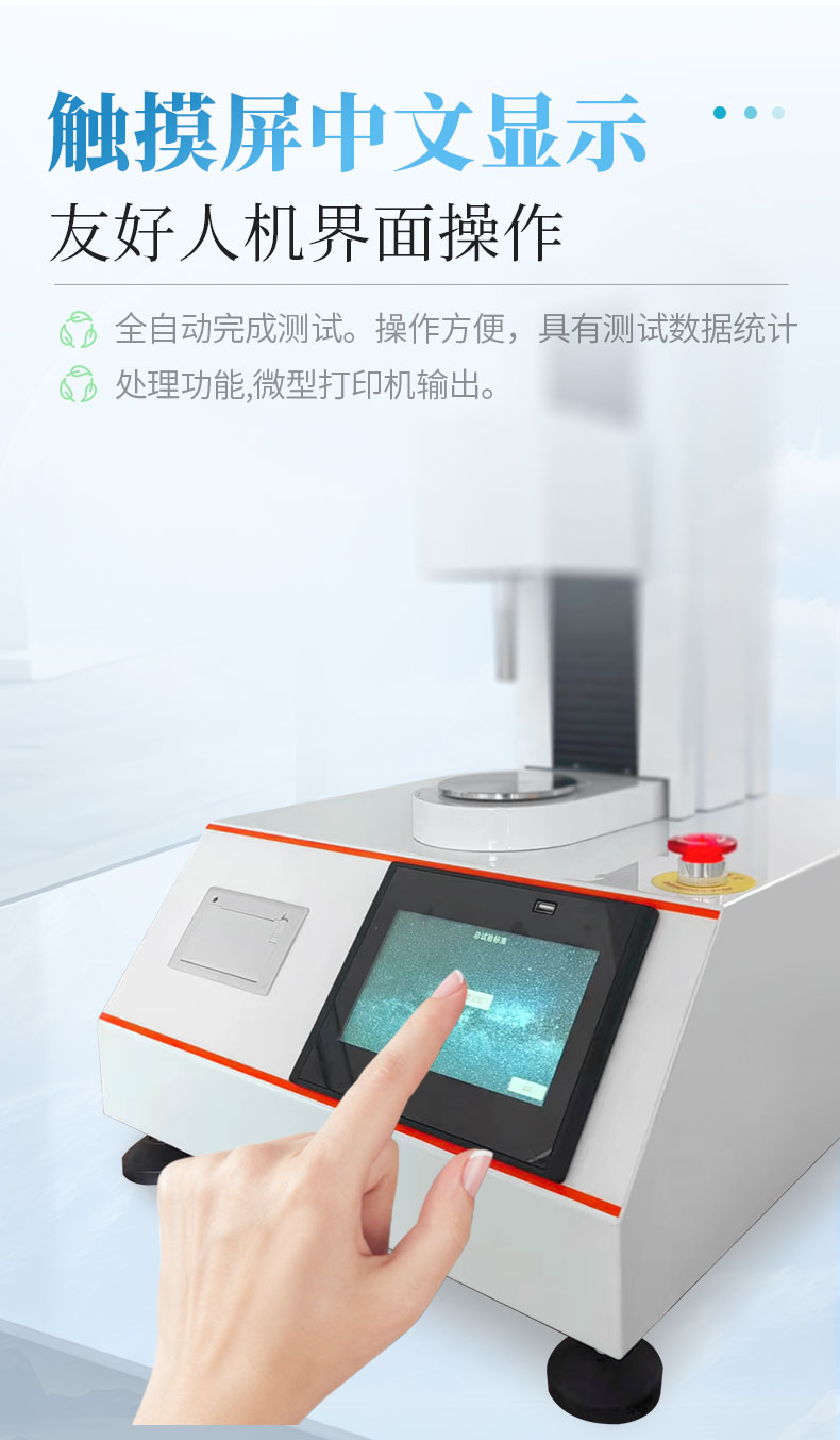 3、大觸摸屏中文顯示,友好人機(jī)界面操作。實(shí)時(shí)顯示測(cè)試曲線,全自動(dòng)完成測(cè)試。操作方便,具有測(cè)試數(shù)據(jù)統(tǒng)計(jì)處理功能,微型打印機(jī)輸出。