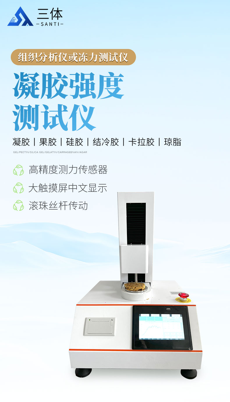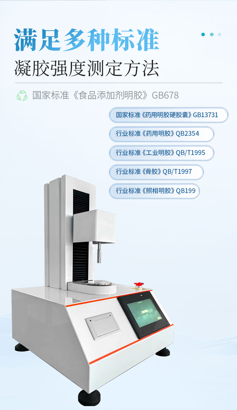 凝膠強(qiáng)度測(cè)儀適用于凝膠、果膠、硅膠、結(jié)冷膠、卡拉膠、瓊脂、阿拉伯膠、黃原膠、魔芋膠和瓜爾膠等的破裂強(qiáng)度、彈性、延展性、拉伸強(qiáng)度、粘附度、回復(fù)性等測(cè)試。凝膠強(qiáng)度測(cè)儀也叫凍力強(qiáng)度儀 ,明膠凝凍強(qiáng)度測(cè)定儀,組織分析儀或凍力測(cè)試儀。