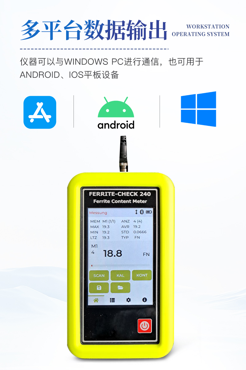 LCD彩色觸摸面板,操作方便,分辨率為320x480像素。帶橡膠保護(hù)套,顯示FN或Fe%的測量結(jié)果。