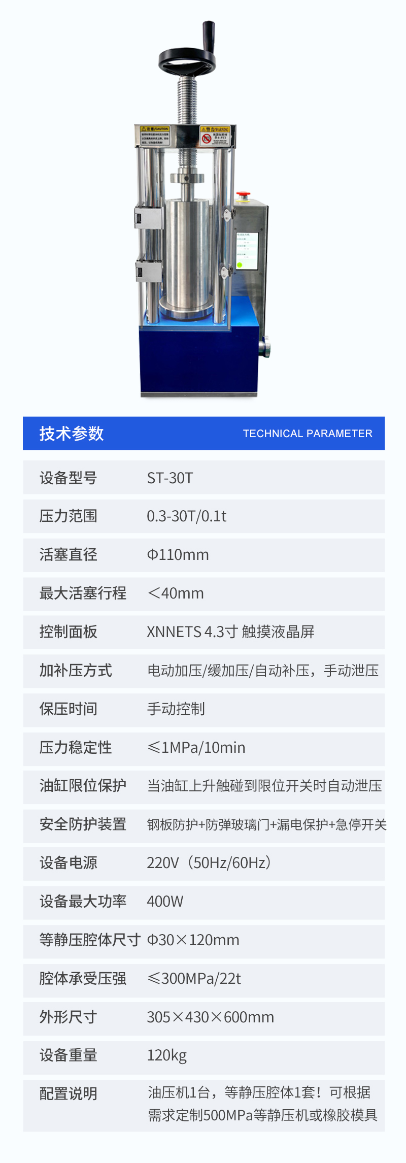 | 配置說(shuō)明 | 油壓機(jī)1臺(tái),等靜壓腔體1套!可根據(jù)需求定制500MPa等靜壓機(jī)或橡膠模具 |