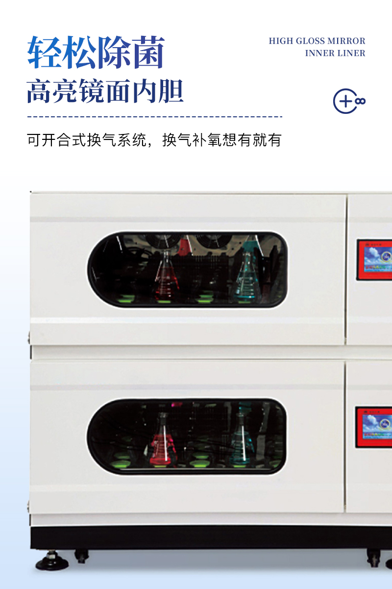 雙層疊式恒溫振蕩搖床人性化可視操作界面,溫馨易懂,全程低壓安全控制,安全呵護(hù)更到位,可開(kāi)合式換氣系統(tǒng),換氣補(bǔ)氧想有就有,高亮鏡面內(nèi)膽,除菌更輕松。