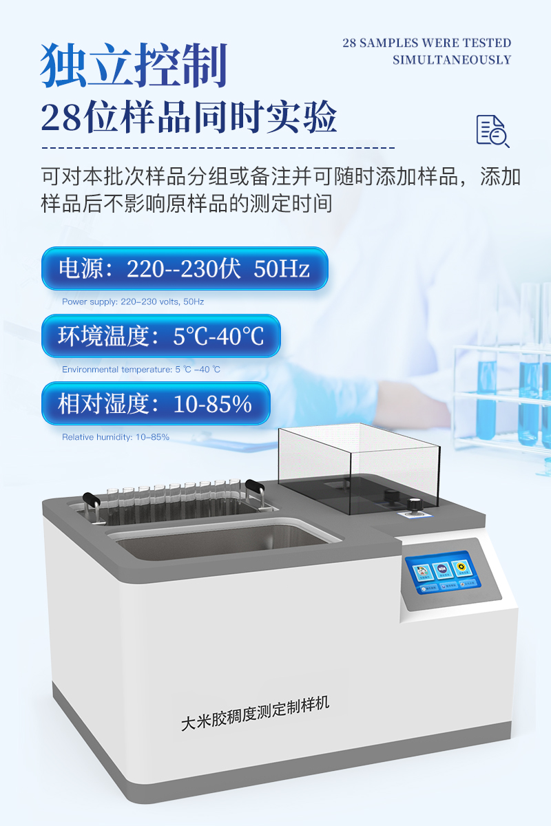 1、用途:適用于糧油檢測大米膠稠度的測量配套設(shè)備,滿足GB/T22294-2008標(biāo)準(zhǔn)要求。2、工作條件:2.1電源:220--230伏, 50Hz;環(huán)境溫度:5℃-40℃;相對(duì)濕度:10-85%3、技術(shù)指標(biāo)要求★全樣品位:28位,★可同時(shí)滿足制膠過程和冰水浴操作。制膠和冰水浴可在屏上獨(dú)立操控,互不影響?!镏颇z控
