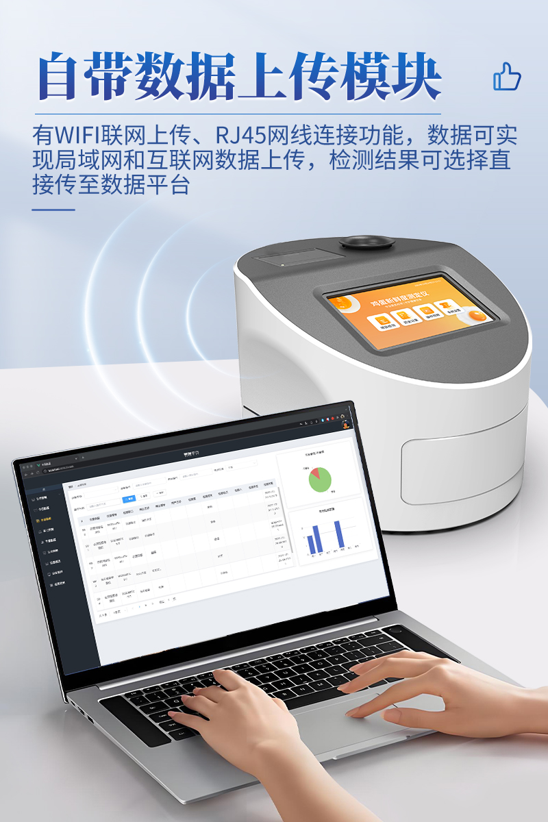 7.儀器可本機存儲數(shù)據(jù),可連接USB端口將數(shù)據(jù)導(dǎo)出存儲。另外,儀器自帶數(shù)據(jù)上傳模塊,具有WIFI聯(lián)網(wǎng)上傳、RJ45網(wǎng)線連接功能,數(shù)據(jù)可實現(xiàn)局域網(wǎng)和互聯(lián)網(wǎng)數(shù)據(jù)上傳,檢測結(jié)果可選擇直接傳至數(shù)據(jù)平臺,進(jìn)行大數(shù)據(jù)分析處理與數(shù)據(jù)統(tǒng)計,達(dá)到長期分析監(jiān)測的目的。